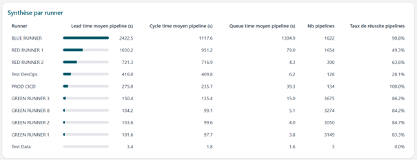 | Runner | Pipelines | Lead Time moyen | % Temps d’attente | Taux de succès |