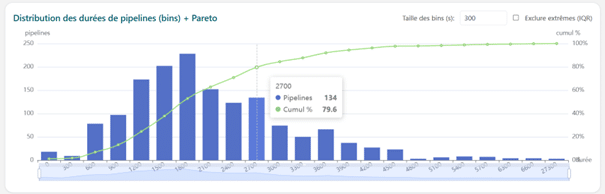 L’analyse de distribution révèle que plus de 37% des pipelines dépassent 40 minutes d’exécution totale, tandis que moins de 10% s’exécutent en moins de 15 minutes. Cette répartition confirme le caractère systémique des lenteurs observées.