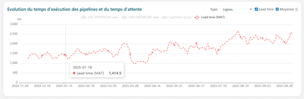 La moyenne glissante sur 7 jours montre une dégradation progressive du Lead Time, passant d’environ 1 400 secondes fin 2024 à 2 400 secondes fin août 2025. Cette augmentation de 71% se décompose en une hausse de 70% du temps d’exécution (1 000 à 1 700 secondes) et de 40% du temps d’attente (500 à 700 secondes).