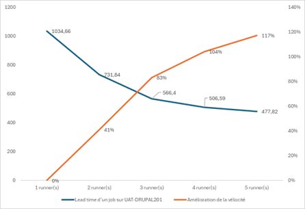 Avec 2 runners, le Lead Time moyen d’un pipeline passerait à 39 minutes (soit 5 minutes de gain). En augmentant les capacités des runners, on peut également espérer gagner en durée sur les jobs longs.